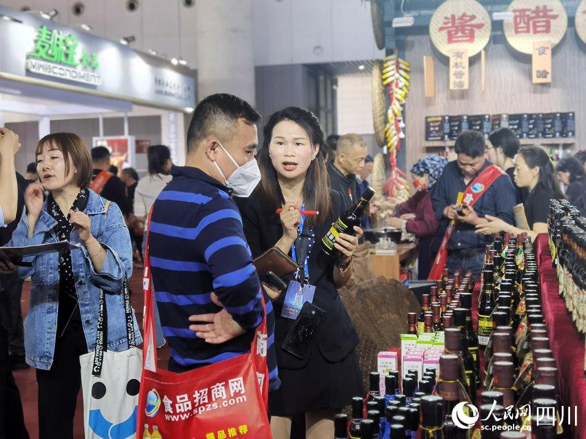 参展商正在向客户推介产品。人民网 王洪江摄