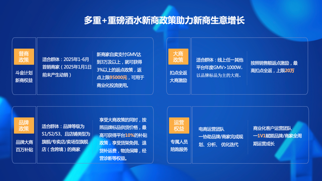 2025年,快手酒水行业也针对酒水商家推出专属扶持政策。其中新商斗金计划针对今年1-6月的首销商家,支付GMV达到一定目标可获得3%的磁力金牛返点,最高可返9.5万元,可用于商业化投流。