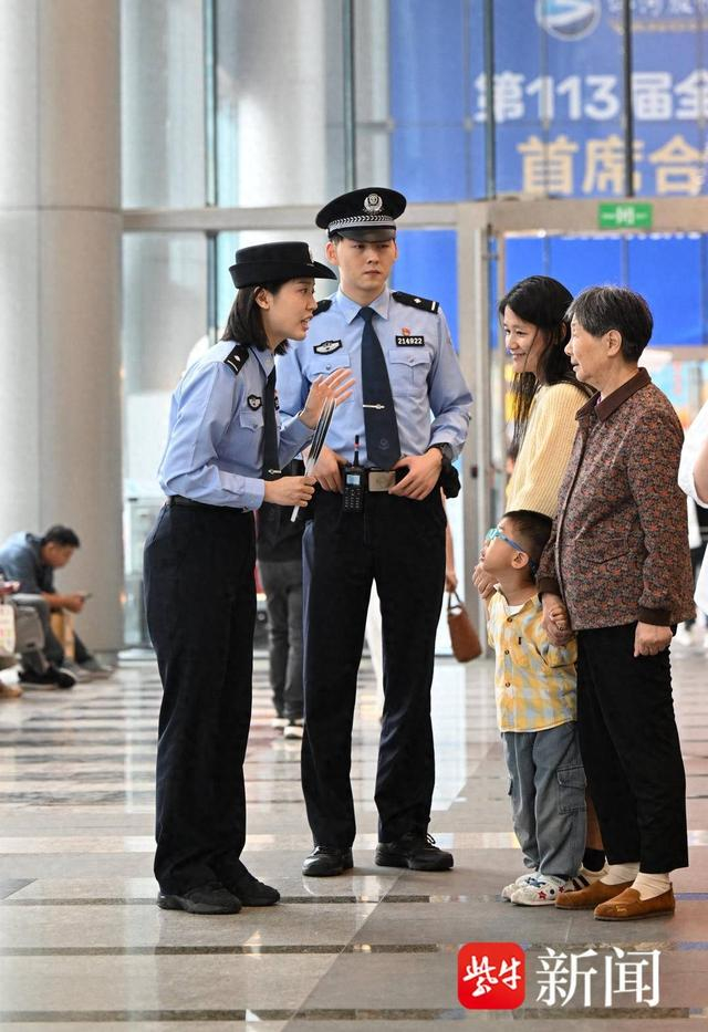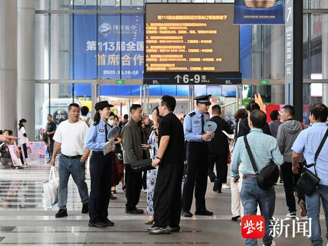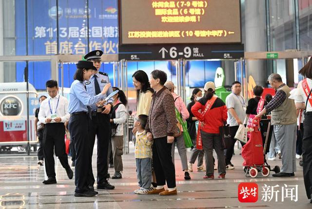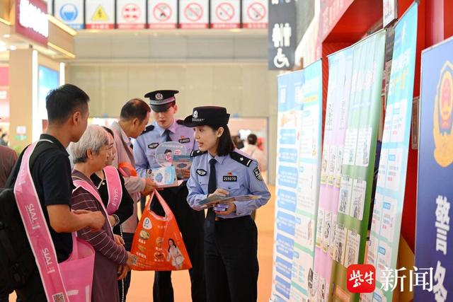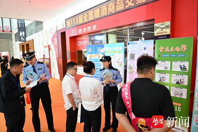 10月16日,第113届全国糖酒商品交易会盛大开幕,南京市公安局建邺分局民警在交易会现场设置反诈宣传点,耐心解答群众疑问,现场传授实用反诈技巧,并为入场观众提供引导和帮助。