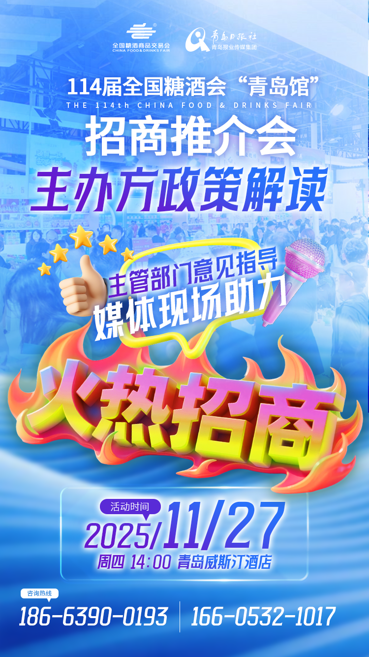 目前,2026年第114届全国糖酒会招商已全面启动!为助力企业拓渠道、亮品牌、提增长,搭建起更高效的资源对接平台,青岛日报社联合全国糖酒会主办方中粮会展(北京)有限公司联合打造第114届全国糖酒会“青岛馆”,聚合青岛酒类、休闲食品、海洋科技、农品加工四大品类标杆企业,充分发挥集群优势,为产业合作赢得更大舞台。