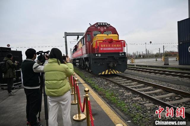 3月7日,四川成都,一列从荷兰蒂尔堡出发,满载德国葡萄酒、法国奶酪、比利时巧克力等商品的成都国际班列第112届全国糖酒商品交易会专列(简称“糖酒会专列”)抵达成都国际铁路港集装箱中心站。中新社记者 张浪 摄